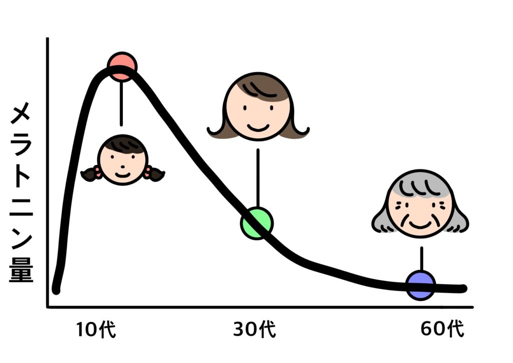 睡眠を促すホルモン「メラトニン」は加齢とともに分泌量が減っていき、体内時計を調整する力も弱まります。50歳を過ぎると眠りが浅くなったり、夜中に目が覚めたりしやすくなったりするのは、メラトニンが不足するためです。