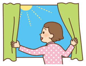 起床後すぐにカーテンを開けて太陽の光を浴びましょう。朝の光が体内時計をリセットし、同時に幸せホルモンといわれている神経伝達物質「セロトニン」が分泌されます。セロトニンが、夜になるとメラトニンに変換され、寝つきやすくなります。